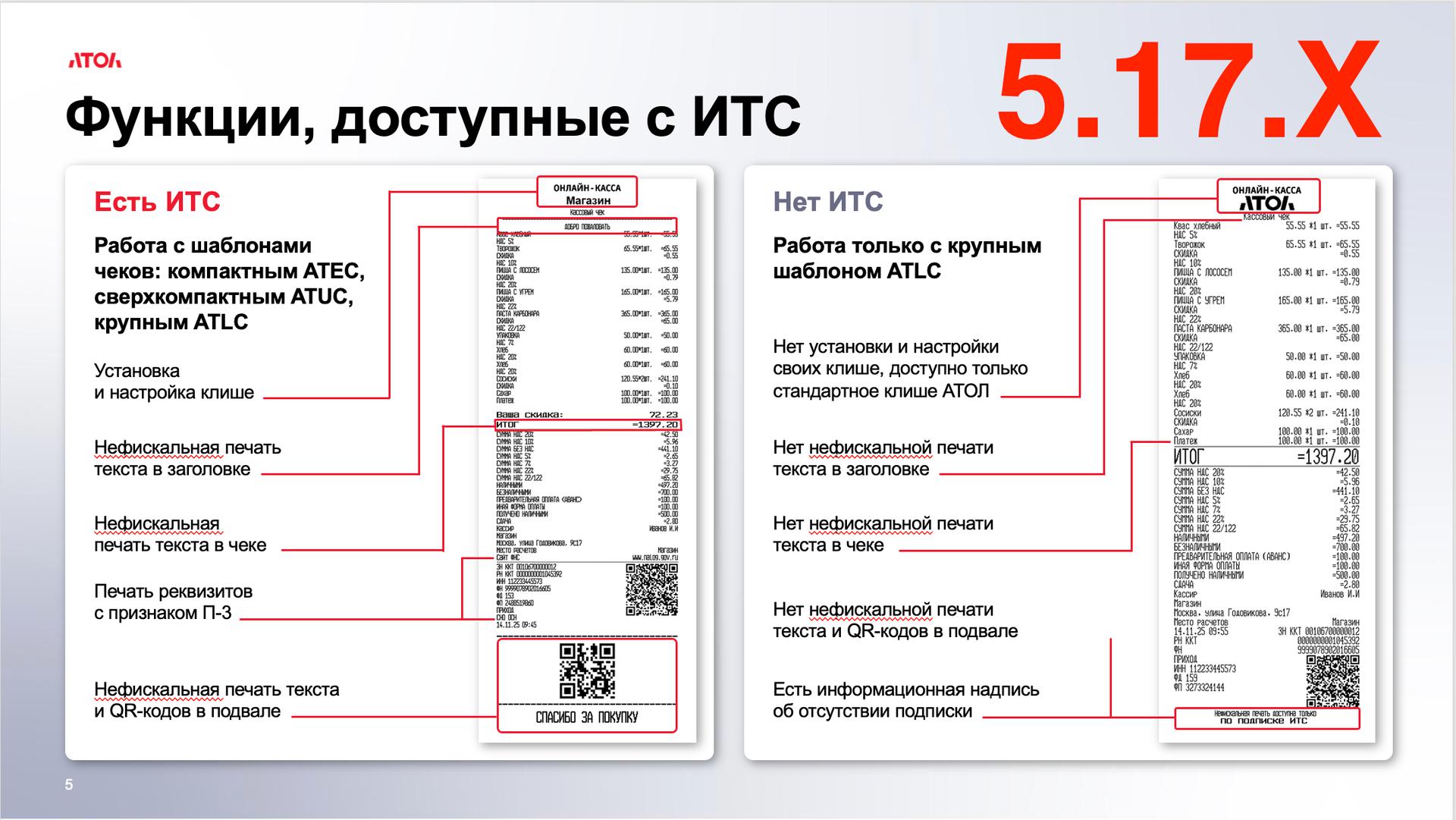 Обновляя ККТ на версию конфигурации ПО5.17.0 (с НДС 22%), вы автоматически соглашаетесь с реализованными ограничениями, в том числе Нефискальной печатью (лицензия № 17), которая без подписки ИТС не будет печататься.